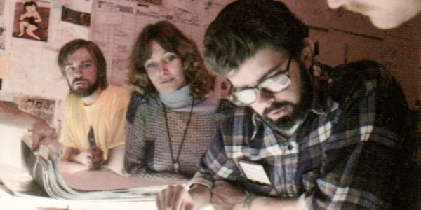 Peter's first job at the age of 19 on Star Wars working in the animation department. looks on as George Lucas reviews film wedges on the ILM giant light table.